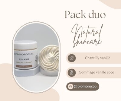 Le pack duo est composé de deux soins: un gommage pour exfolier et une chantilly pour nourrir et hydrater